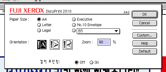 선택자에서 사용하고 있는 Docu 2010 프린터를 선택하면 첨부파일처럼 페이지설정하면 맨 처음 사진처럼 나오고 프린트에 들어가면 두번째 사진처럼 나오네요...