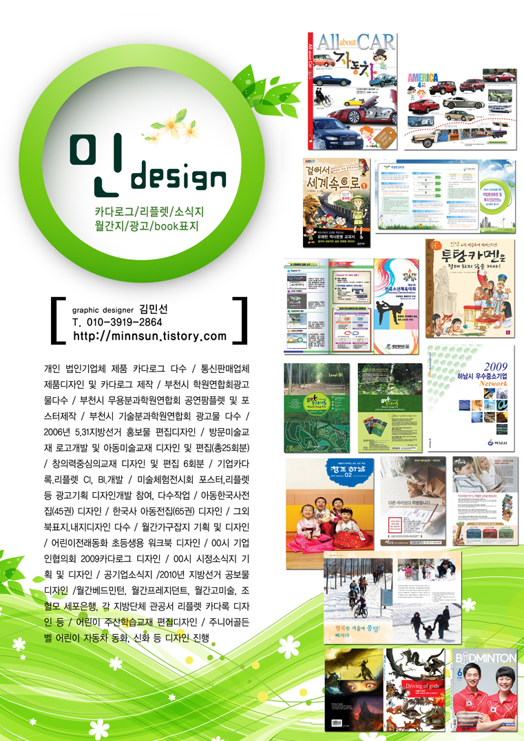 맥편집디자이너 김민선입니다. 맥편집 경력 15년 이상이고요 소식지 월간지 기업카다록 리플렛 어린이 동화책 단행본 표지 학습지등 디자인과 조판 인쇄에관한 작업까지 모두 가능합니다.